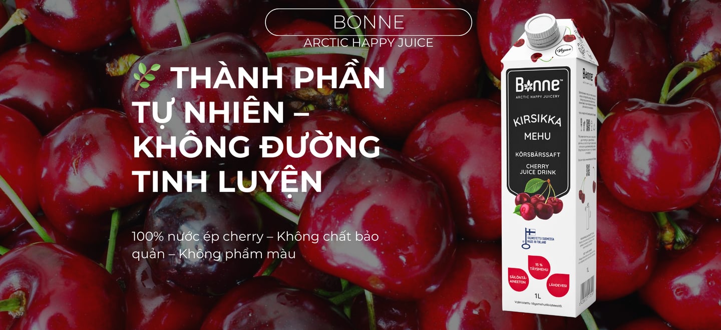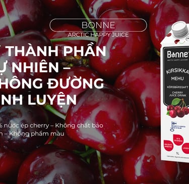 Nước ép cherry Bonne là nước ép nhập khẩu từ Phần Lan, được làm từ cherry tự nhiên, giàu chất chống oxy hóa và vitamin. Sản phẩm giúp hỗ trợ tim mạch, cải thiện giấc ngủ, làm đẹp da và không chứa chất bảo quản.